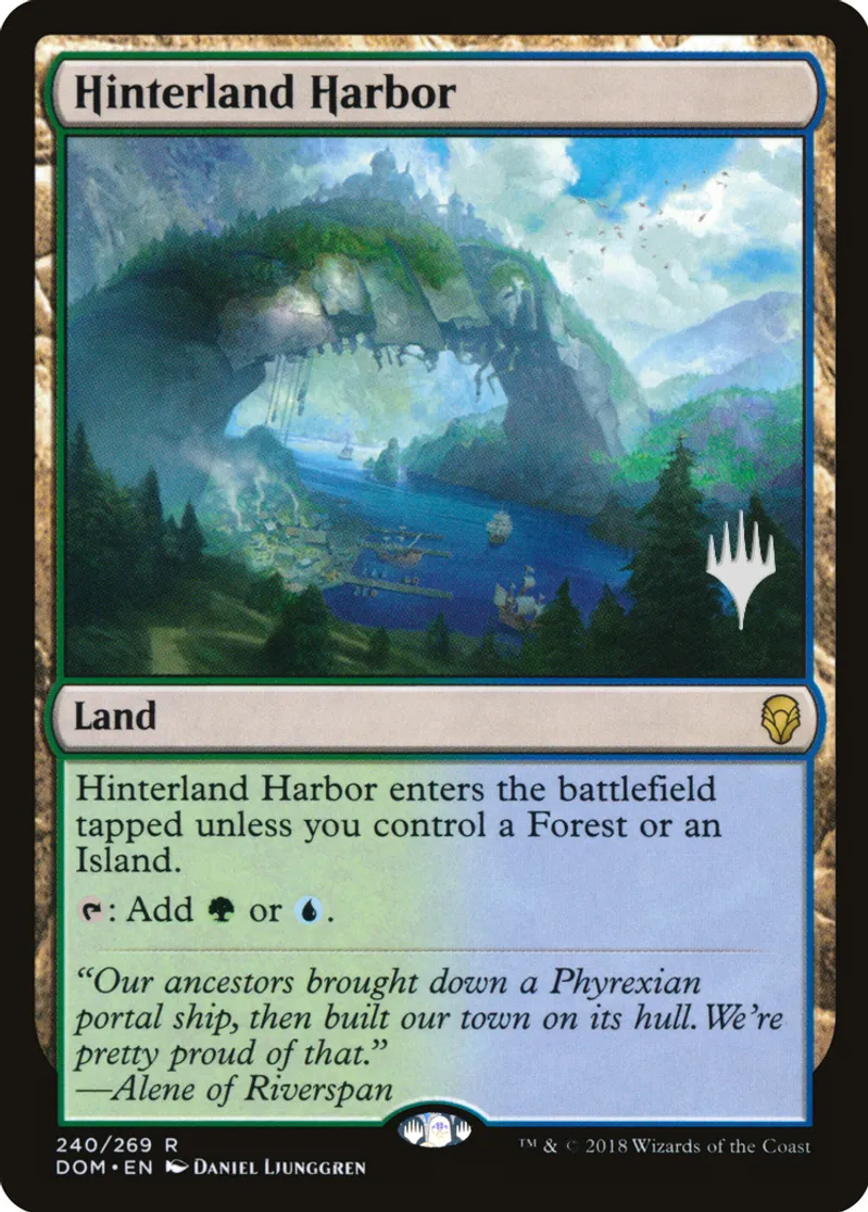 | Oracle Text | Hinterland Harbor enters the battlefield tapped unless you control a Forest or an Island.\r\n{{t}}: Add {{g}} or {{u}}. | ||