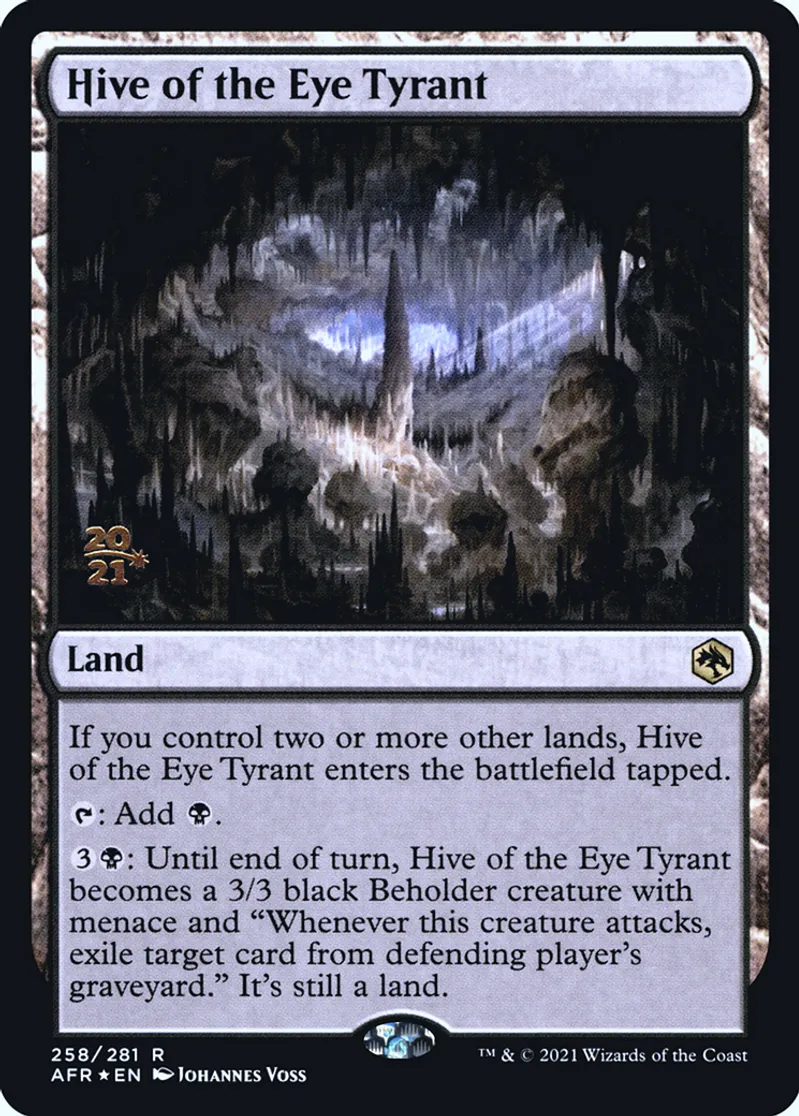 {{3}}{{b}}: Until end of turn, Hive of the Eye Tyrant becomes a 3/3 black Beholder creature with menace and "Whenever this creature attacks, exile target card from defending player's graveyard." It's still a land. | ||