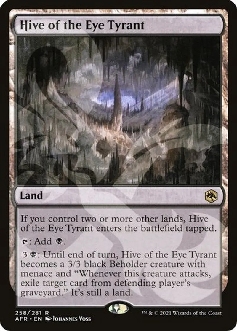 {{3}}{{b}}: Until end of turn, Hive of the Eye Tyrant becomes a 3/3 black Beholder creature with menace and “Whenever this creature attacks, exile target card from defending player’s graveyard.” It’s still a land. | ||