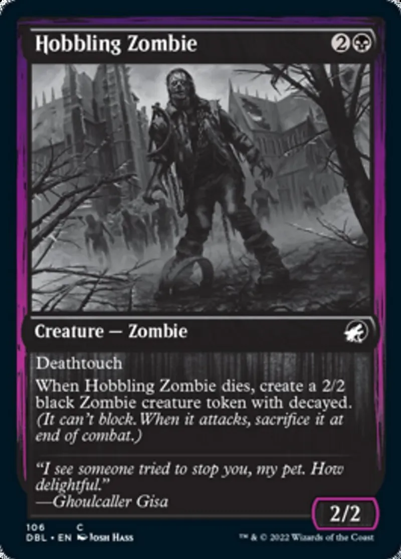 When Hobbling Zombie dies, create a 2/2 black Zombie creature token with decayed. (It can't block. When it attacks, sacrifice it at end of combat.) | ||