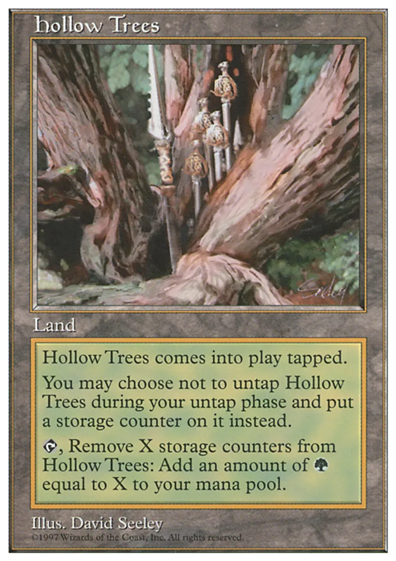 | Oracle Text | Hollow Trees enters the battlefield tapped. You may choose not to untap Hollow Trees during your untap step. At the beginning of your upkeep, if Hollow Trees is tapped, put a storage counter on it. {{t}}, Remove any number of storage counters from Hollow Trees: Add {{g}} to your mana pool for each storage counter removed this way. | ||