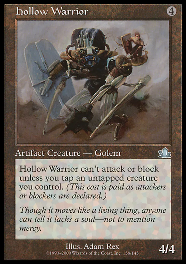 | Oracle Text | Hollow Warrior can't attack or block unless you tap an untapped creature you control not declared as an attacking or blocking creature this combat. | ||