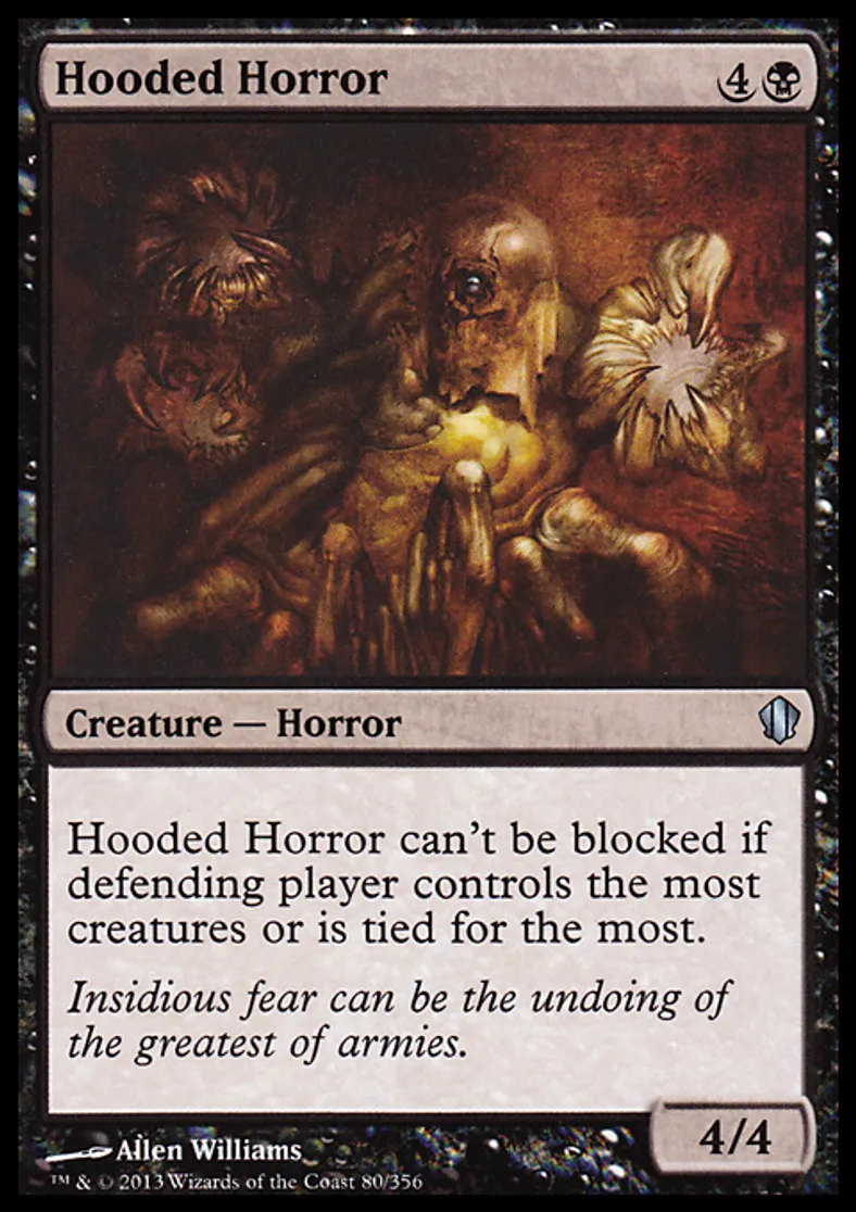 | Oracle Text | Hooded Horror can't be blocked if defending player controls the most creatures or is tied for the most. | ||