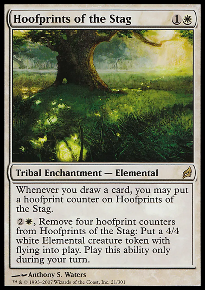 | Oracle Text | Whenever you draw a card, you may put a hoofprint counter on Hoofprints of the Stag. {{2}}{{w}}, Remove four hoofprint counters from Hoofprints of the Stag: Put a 4/4 white Elemental creature token with flying onto the battlefield. Activate this ability only during your turn. | ||