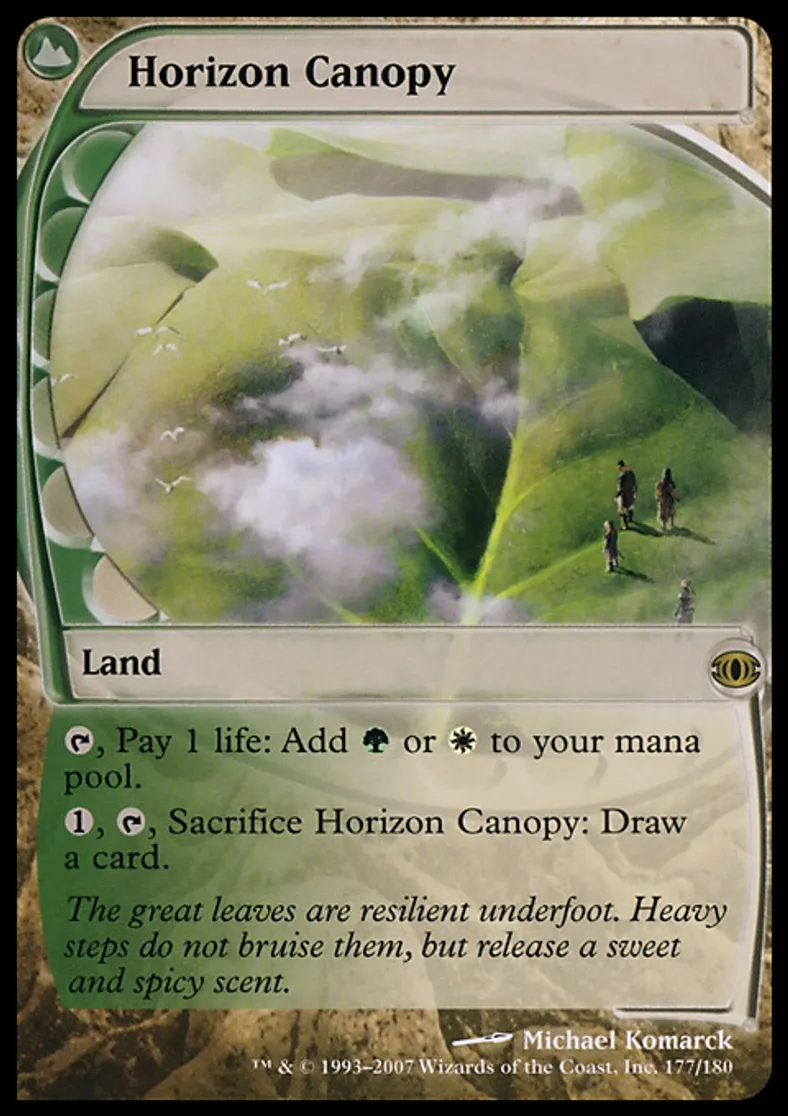 | Oracle Text | {{t}}, Pay 1 life: Add {{g}} or {{w}} to your mana pool. {{1}}, {{t}}, Sacrifice Horizon Canopy: Draw a card. | ||