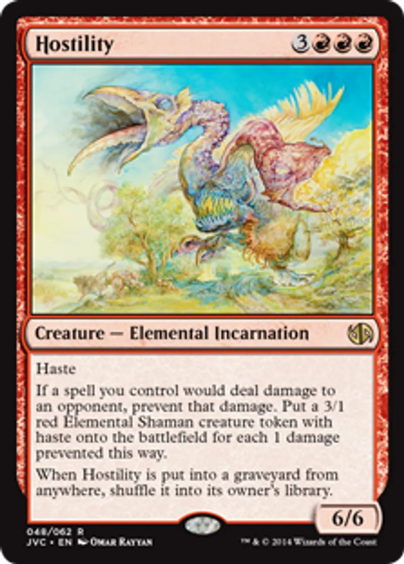 | Oracle Text | Haste If a spell you control would deal damage to an opponent, prevent that damage. Create a 3/1 red Elemental Shaman creature token with haste for each 1 damage prevented this way. When Hostility is put into a graveyard from anywhere, shuffle it into its owner's library. | ||