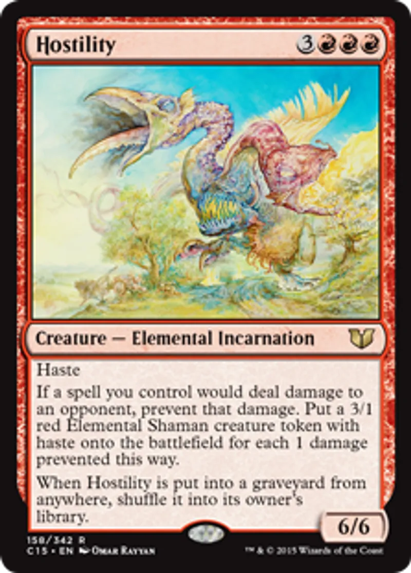| Oracle Text | Haste If a spell you control would deal damage to an opponent, prevent that damage. Put a 3/1 red Elemental Shaman creature token with haste onto the battlefield for each 1 damage prevented this way. When Hostility is put into a graveyard from anywhere, shuffle it into its owner's library. | ||