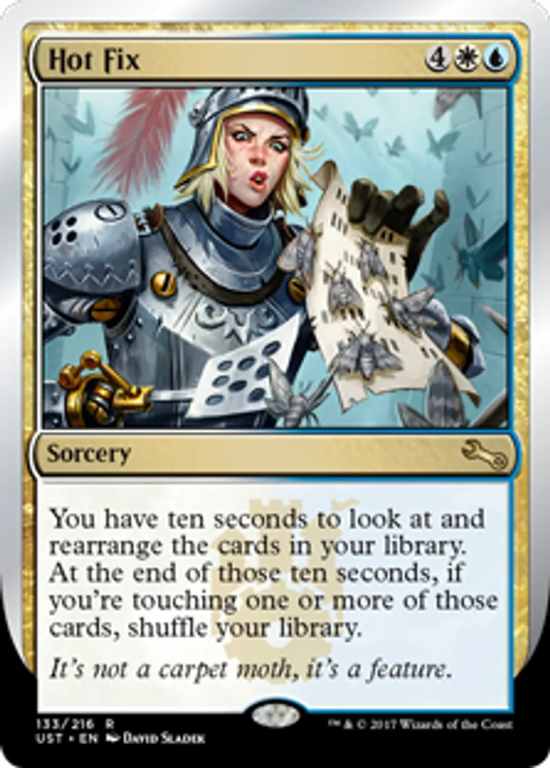 | Oracle Text | You have ten seconds to look at and rearrange the cards in your library. At the end of those ten seconds, if you're touching one or more of those cards, shuffle your library. | ||
