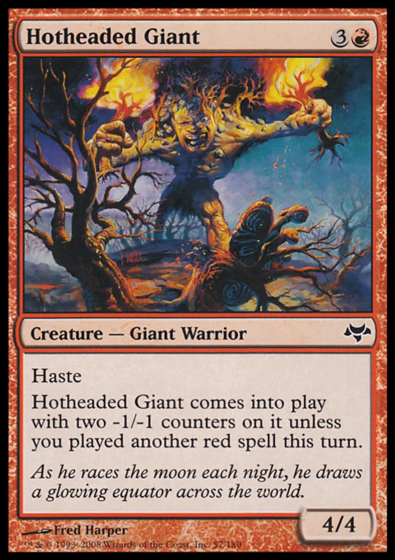 | Oracle Text | Haste Hotheaded Giant enters the battlefield with two -1/-1 counters on it unless you've cast another red spell this turn. | ||