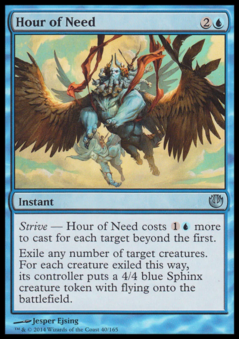| Oracle Text | Strive — Hour of Need costs {{1}}{{u}} more to cast for each target beyond the first. Exile any number of target creatures. For each creature exiled this way, its controller puts a 4/4 blue Sphinx creature token with flying onto the battlefield. | ||