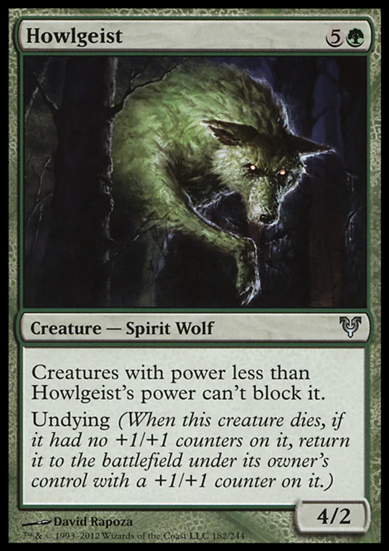 | Oracle Text | Creatures with power less than Howlgeist's power can't block it. Undying (When this creature dies, if it had no +1/+1 counters on it, return it to the battlefield under its owner's control with a +1/+1 counter on it.) | ||