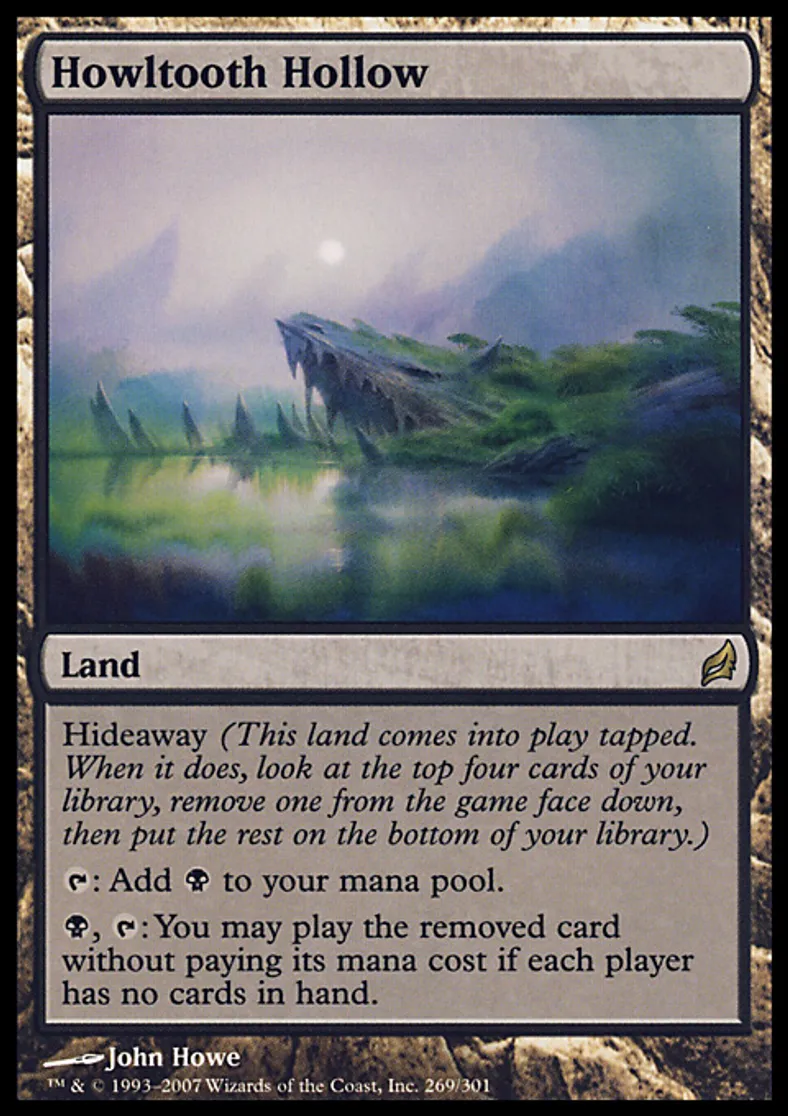 | Oracle Text | Hideaway (This land enters the battlefield tapped. When it does, look at the top four cards of your library, exile one face down, then put the rest on the bottom of your library.) {{t}}: Add {{b}} to your mana pool. {{b}}, {{t}}: You may play the exiled card without paying its mana cost if each player has no cards in hand. | ||