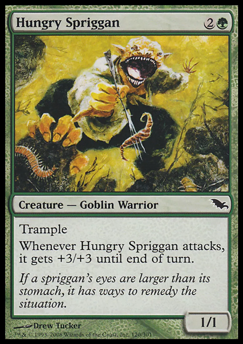 | Oracle Text | Trample Whenever Hungry Spriggan attacks, it gets +3/+3 until end of turn. | ||