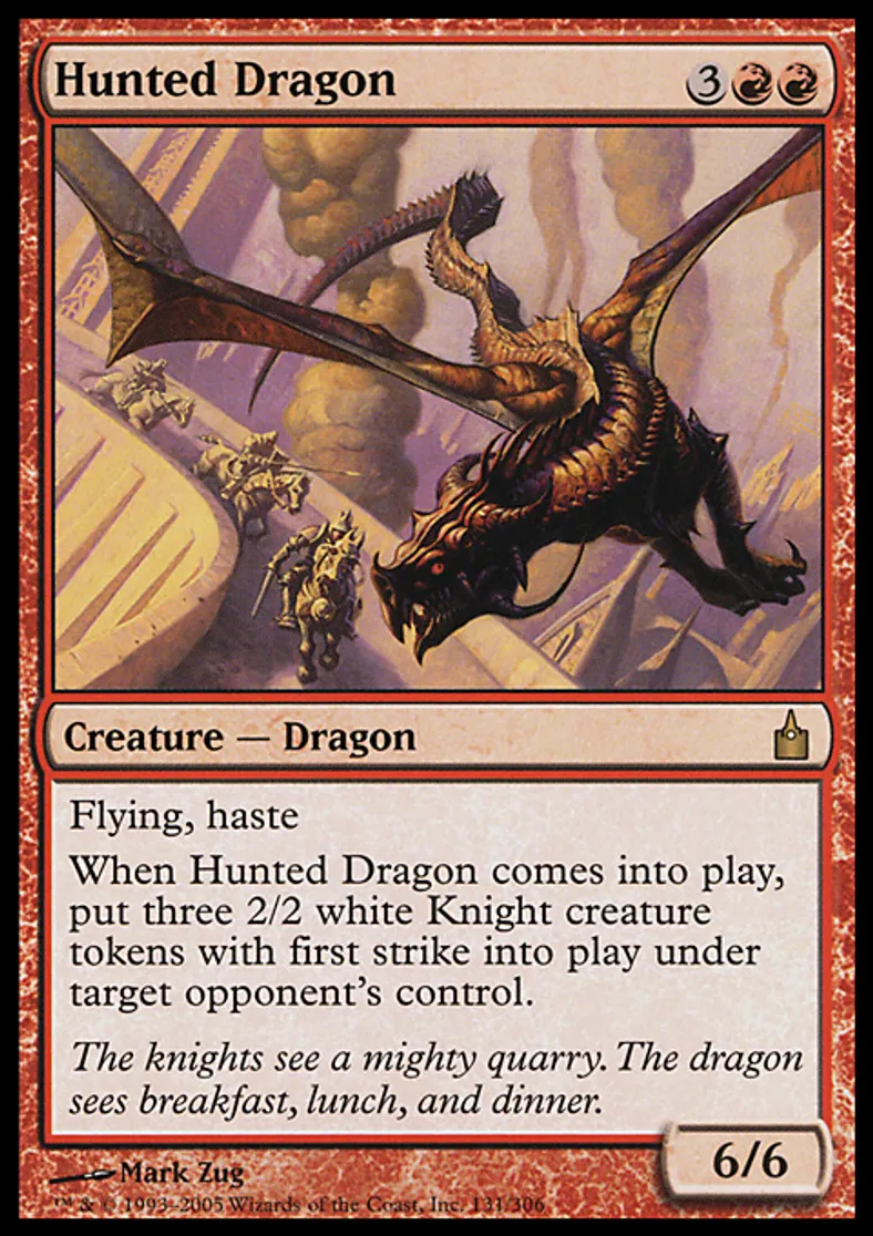 | Oracle Text | Flying, haste When Hunted Dragon enters the battlefield, put three 2/2 white Knight creature tokens with first strike onto the battlefield under target opponent's control. | ||