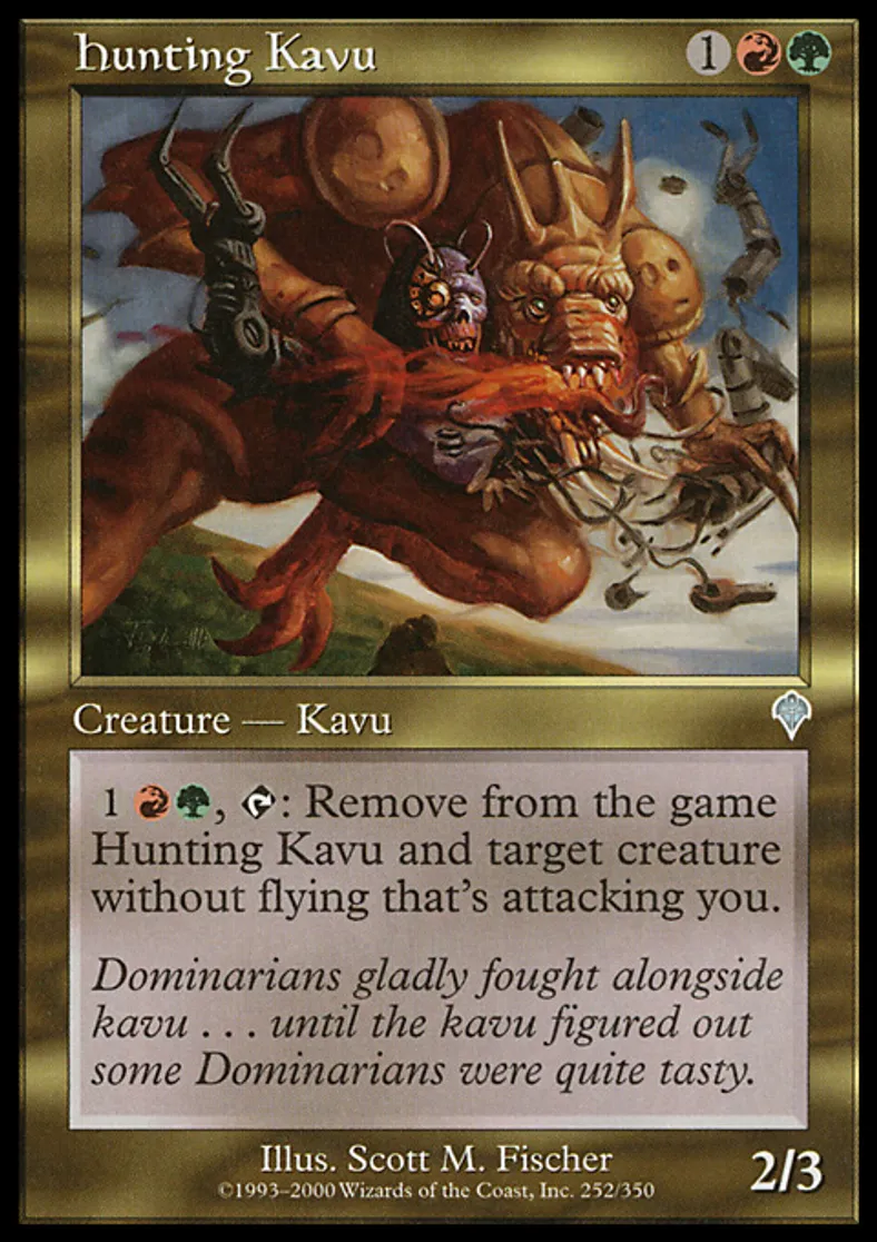 | Oracle Text | {{1}}{{r}}{{g}}, {{t}}: Exile Hunting Kavu and target creature without flying that's attacking you. | ||