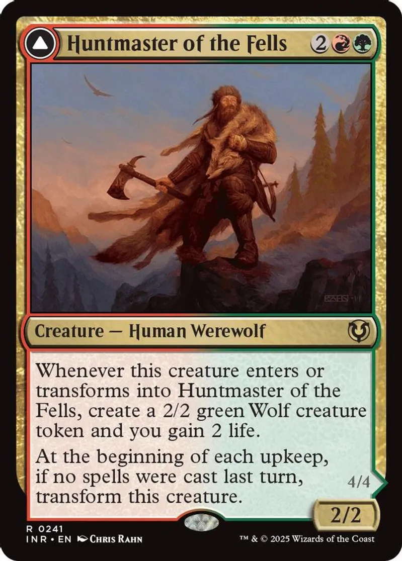 | Oracle Text | whenever this creature enters or transforms into huntmaster of the fells, create a 2/2 green wolf creature token and you gain 2 life.