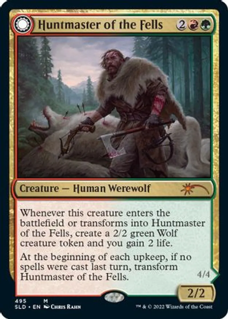 | Oracle Text | Whenever this creature enters the battlefield or transforms into Huntmaster of the Fells, create a 2/2 green wolf token and you gain 2 life.