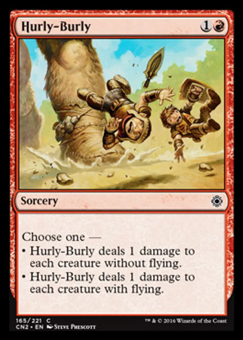 | Oracle Text | Choose one — • Hurly-Burly deals 1 damage to each creature without flying. • Hurly-Burly deals 1 damage to each creature with flying. | ||