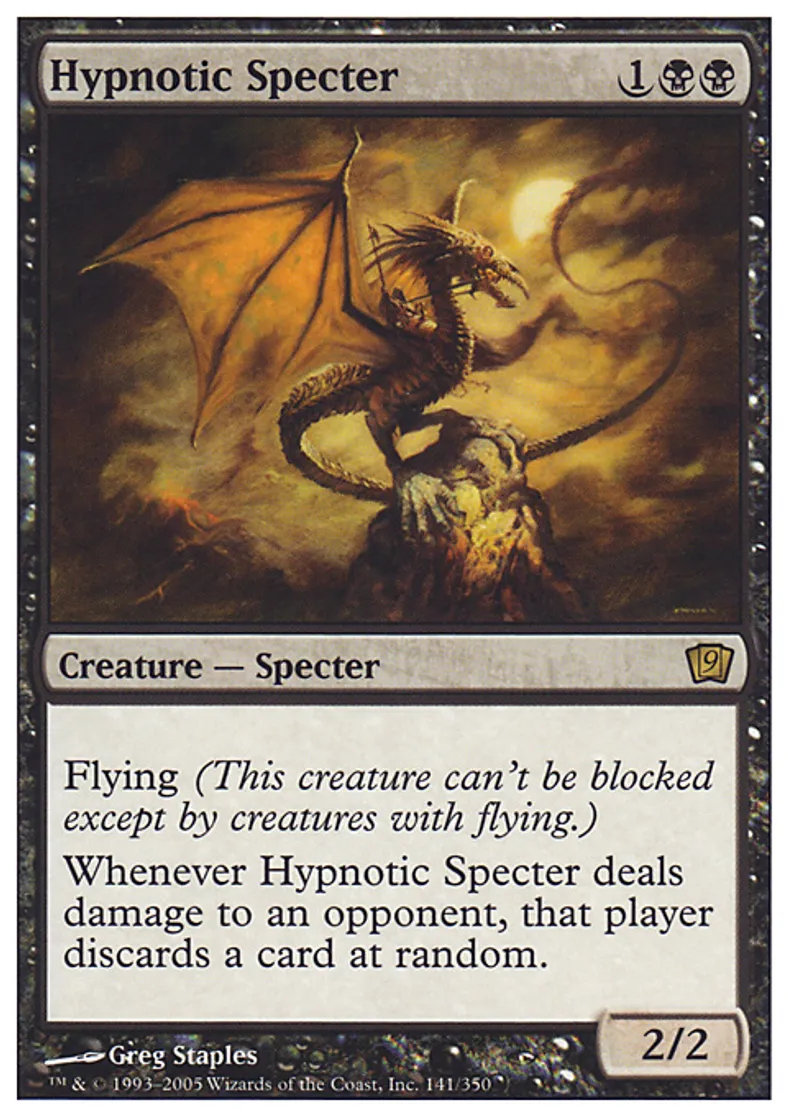 | Oracle Text | Flying Whenever Hypnotic Specter deals damage to an opponent, that player discards a card at random. | ||