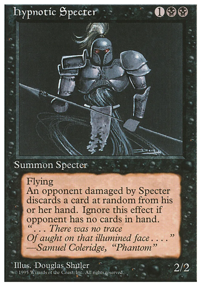| Oracle Text | Flying Whenever Hypnotic Specter deals damage to an opponent, that player discards a card at random. | ||