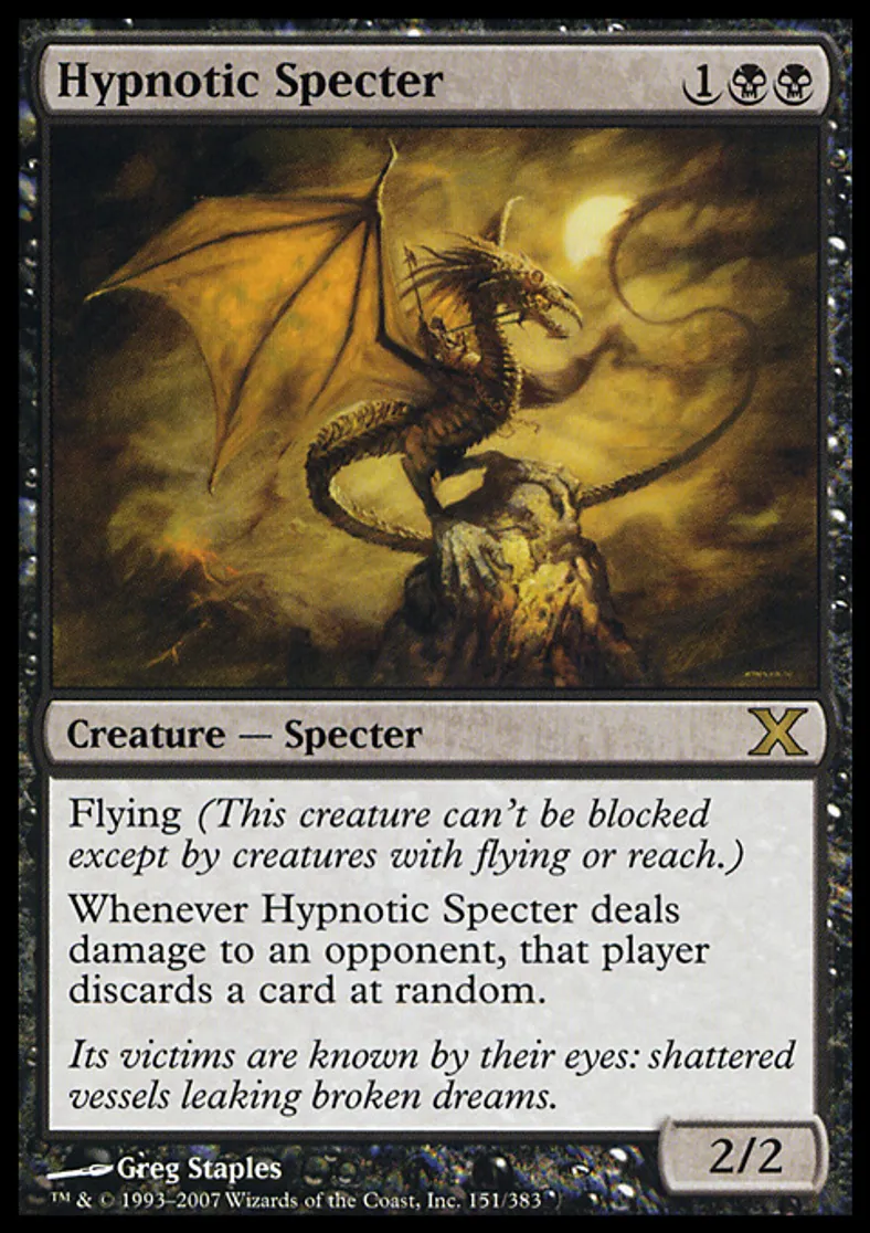 | Oracle Text | Flying Whenever Hypnotic Specter deals damage to an opponent, that player discards a card at random. | ||