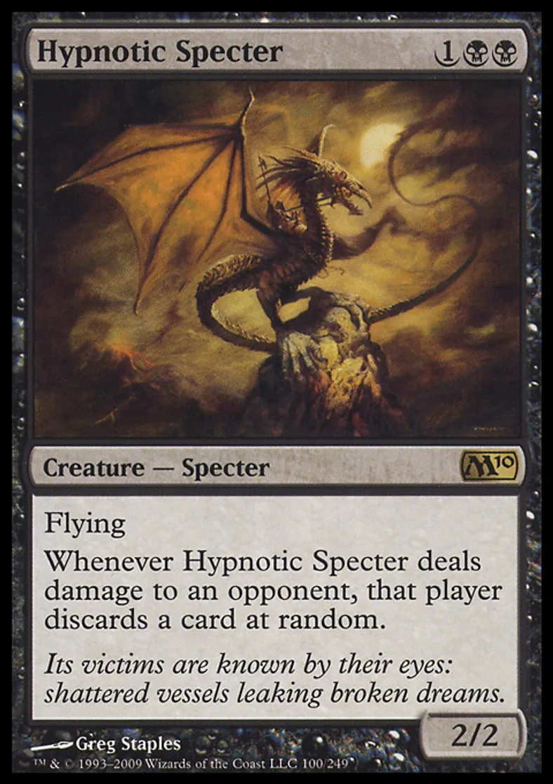 | Oracle Text | Flying Whenever Hypnotic Specter deals damage to an opponent, that player discards a card at random. | ||