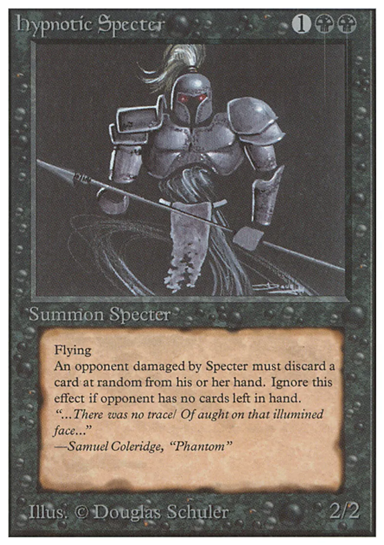 | Oracle Text | Flying Whenever Hypnotic Specter deals damage to an opponent, that player discards a card at random. | ||