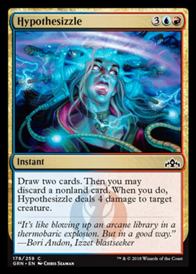 | Oracle Text | Draw two cards. Then you may discard a nonland card. When you do, Hypothesizzle deals 4 damage to target creature. | ||