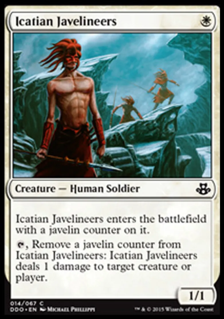 | Oracle Text | Icatian Javelineers enters the battlefield with a javelin counter on it. {{t}}, Remove a javelin counter from Icatian Javelineers: Icatian Javelineers deals 1 damage to target creature or player. | ||