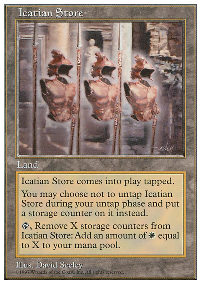 | Oracle Text | Icatian Store enters the battlefield tapped. You may choose not to untap Icatian Store during your untap step. At the beginning of your upkeep, if Icatian Store is tapped, put a storage counter on it. {{t}}, Remove any number of storage counters from Icatian Store: Add {{w}} to your mana pool for each storage counter removed this way. | ||