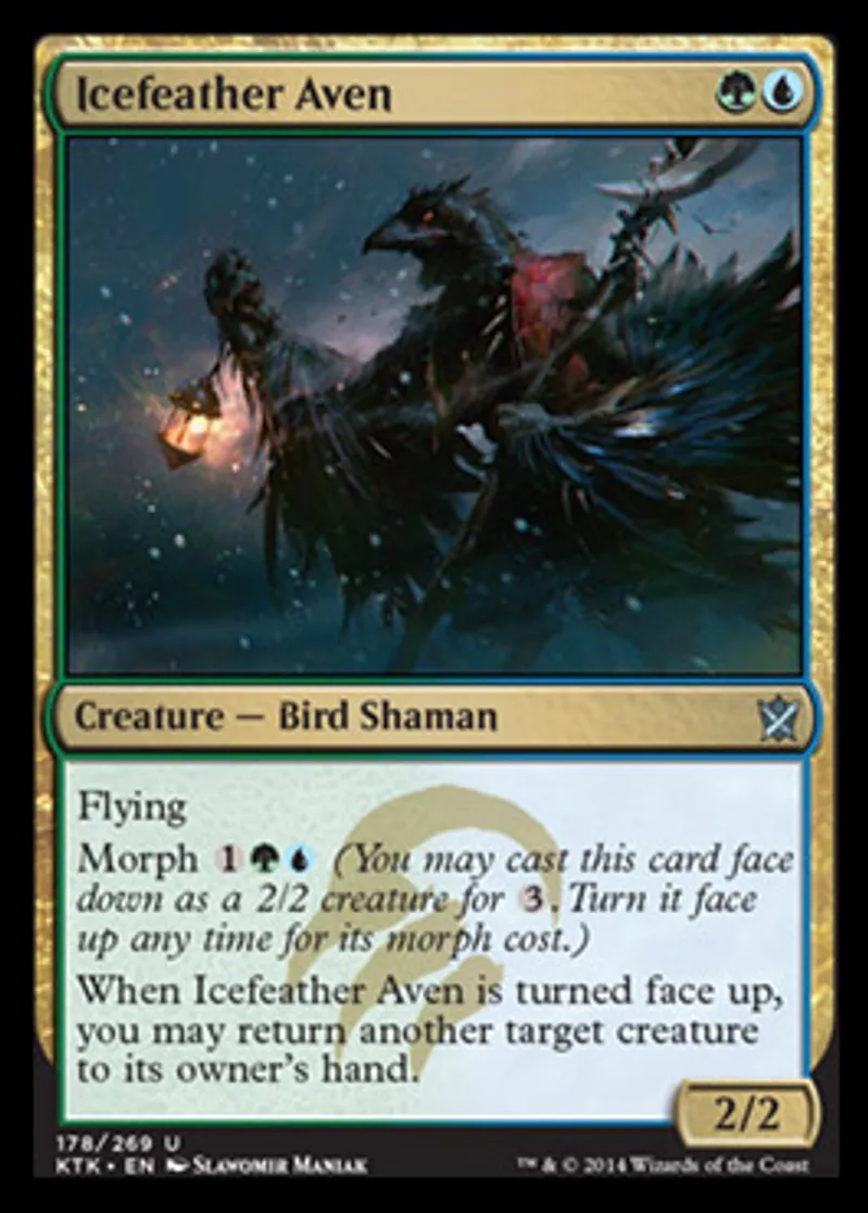 | Oracle Text | Flying Morph {{1}}{{g}}{{u}} (You may cast this card face down as a 2/2 creature for {{3}}. Turn it face up any time for its morph cost.) When Icefeather Aven is turned face up, you may return another target creature to its owner's hand. | ||