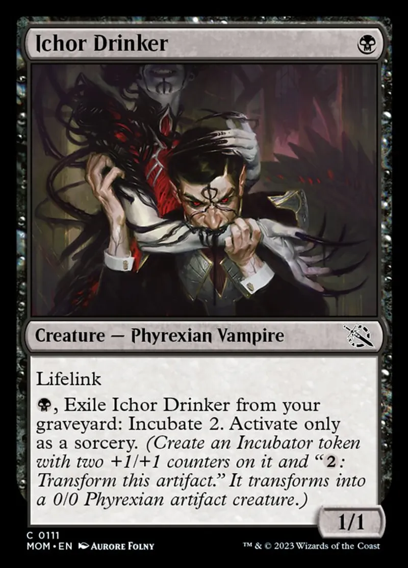 {B}, Exile Ichor Drinker from your graveyard: Incubate 2. Activate only as a sorcery. (Create an Incubator token with two +1/+1 counters on it and "{2}: Transform this artifact." It transforms into a 0/0 Phyrexian artifact creature.) | ||