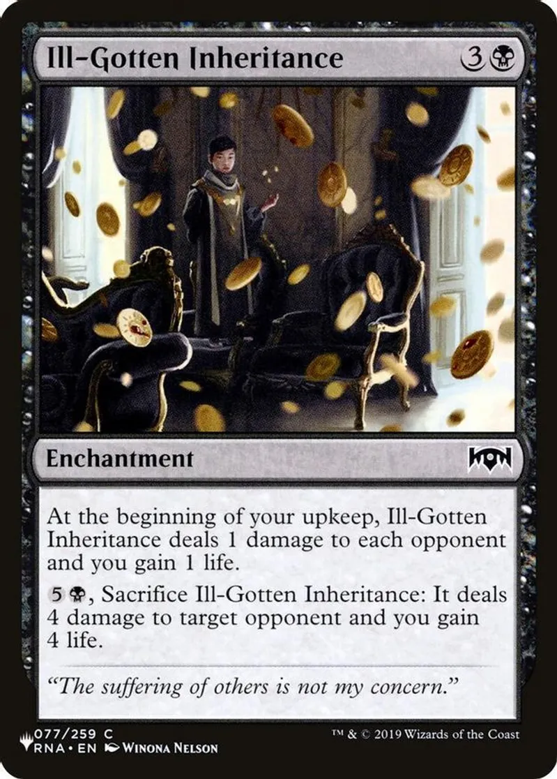 | Oracle Text | at the beginning of your upkeep, ill-gotten inheritance deals 1 damage to each opponent and you gain 1 life.