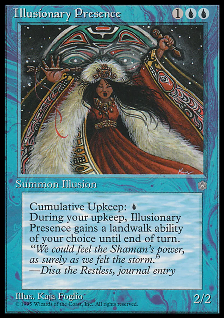 | Oracle Text | Cumulative upkeep {{u}} (At the beginning of your upkeep, put an age counter on this permanent, then sacrifice it unless you pay its upkeep cost for each age counter on it.) At the beginning of your upkeep, choose a land type. Illusionary Presence gains landwalk of the chosen type until end of turn. | ||