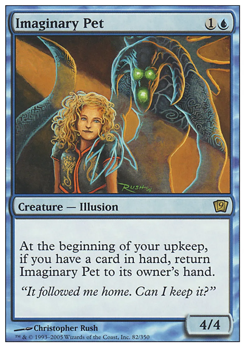 | Oracle Text | At the beginning of your upkeep, if you have a card in hand, return Imaginary Pet to its owner's hand. | ||
