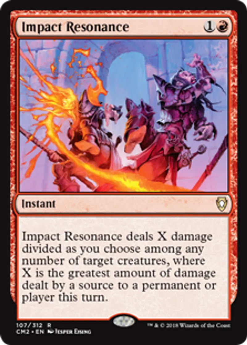 | Oracle Text | Impact Resonance deals X damage divided as you choose among any number of target creatures, where X is the greatest amount of damage dealt by a source to a permanent or player this turn. | ||