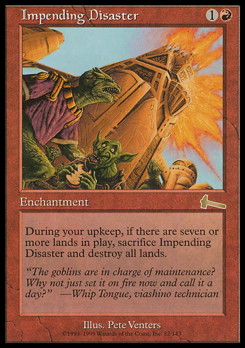 | Oracle Text | At the beginning of your upkeep, if there are seven or more lands on the battlefield, sacrifice Impending Disaster and destroy all lands. | ||