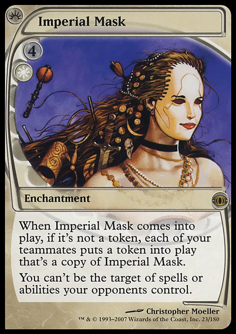 | Oracle Text | When Imperial Mask enters the battlefield, if it's not a token, each of your teammates puts a token that's a copy of Imperial Mask onto the battlefield. You have hexproof. (You can't be the target of spells or abilities your opponents control.) | ||