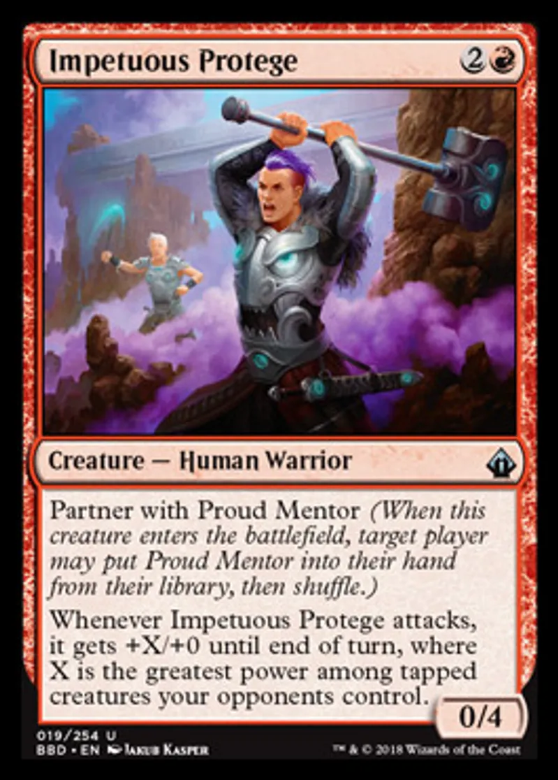 | Oracle Text | Partner with Proud Mentor (When this creature enters the battlefield, target player may put Proud Mentor into their hand from their library, then shuffle.) Whenever Impetuous Protege attacks, it gets +X/+0 until end of turn, where X is the greatest power among tapped creatures your opponents control. | ||