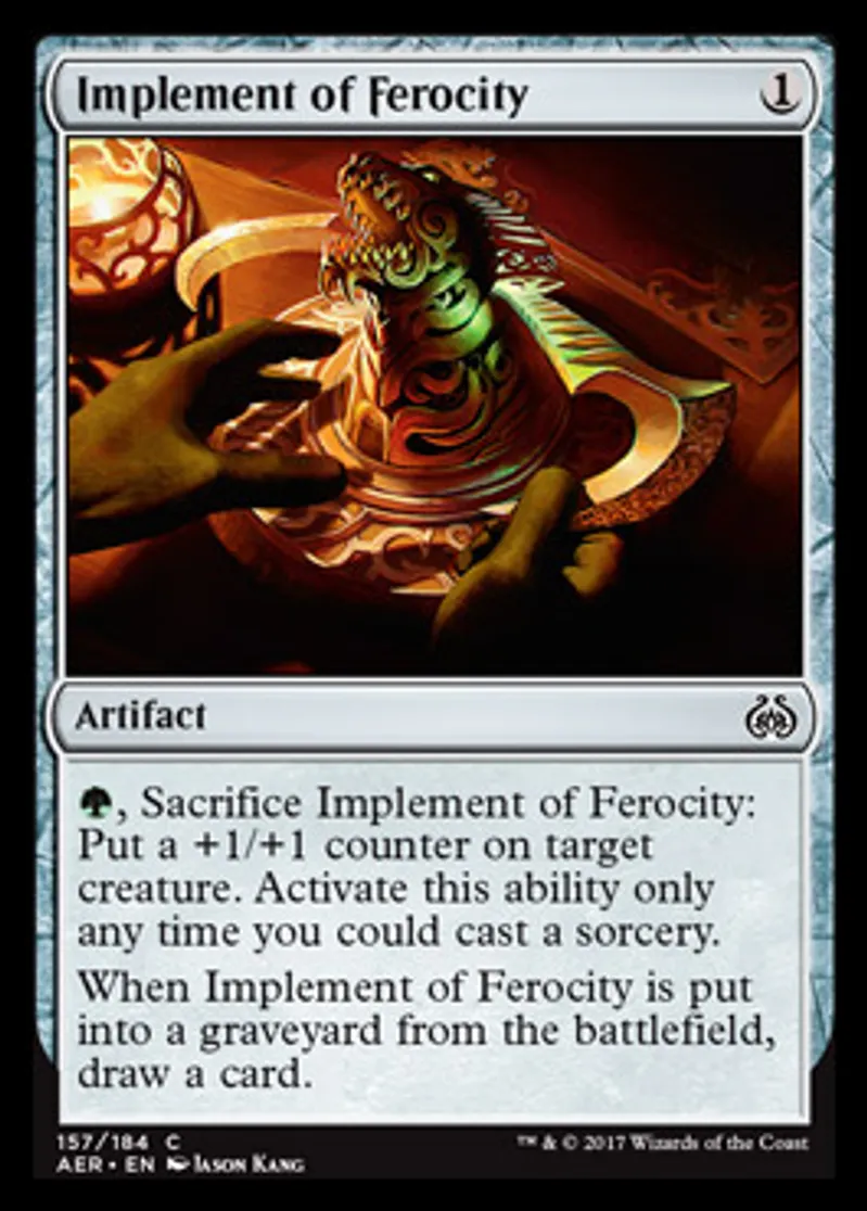 | Oracle Text | {{g}}, Sacrifice Implement of Ferocity: Put a +1/+1 counter on target creature. Activate this ability only any time you could cast a sorcery. When Implement of Ferocity is put into a graveyard from the battlefield, draw a card. | ||