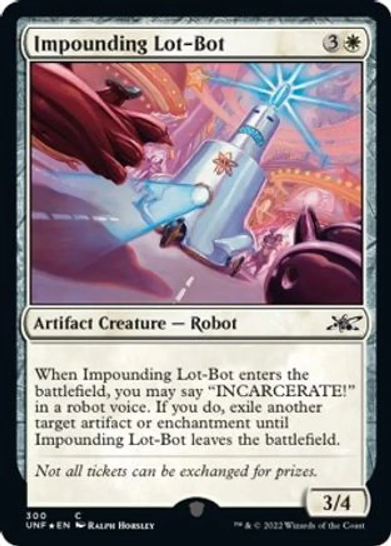 | Oracle Text | When Impounding Lot-Bot enters the battlefield, you may say "INCARCERATE!" in a robot voice. If you do, exile another target artifact or enchantment until Impounding Lot-Bot leaves the battlefield. | ||