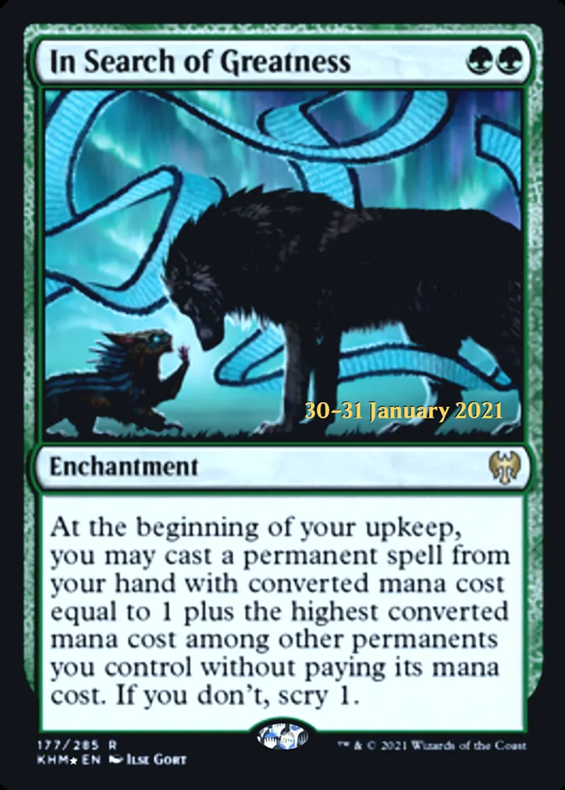 Magic: the Gathering (mtg) Rare Enchantment In Search of Greatness from Prerelease Cards (pPRE) last updated 2026-02-21 16:34:06