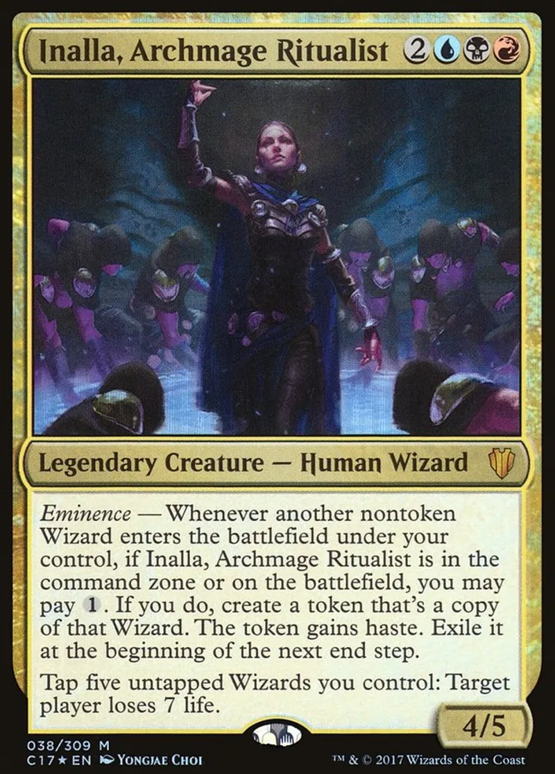 | Oracle Text | Eminence — Whenever another nontoken Wizard enters the battlefield under your control, if Inalla, Archmage Ritualist is in the command zone or on the battlefield, you may pay {{1}}. If you do, create a token that's a copy of that Wizard. The token gains haste. Exile it at the beginning of the next end step. Tap five untapped Wizards you control: Target player loses 7 life. | ||