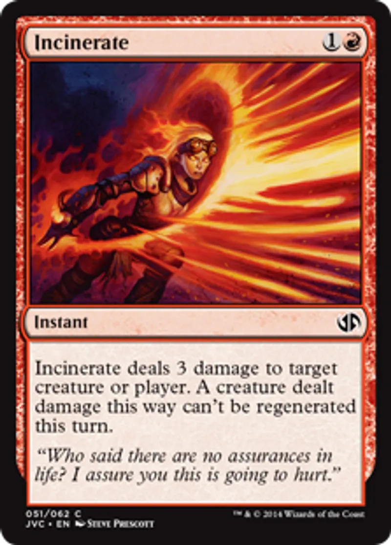 | Oracle Text | Incinerate deals 3 damage to target creature or player. A creature dealt damage this way can't be regenerated this turn. | ||