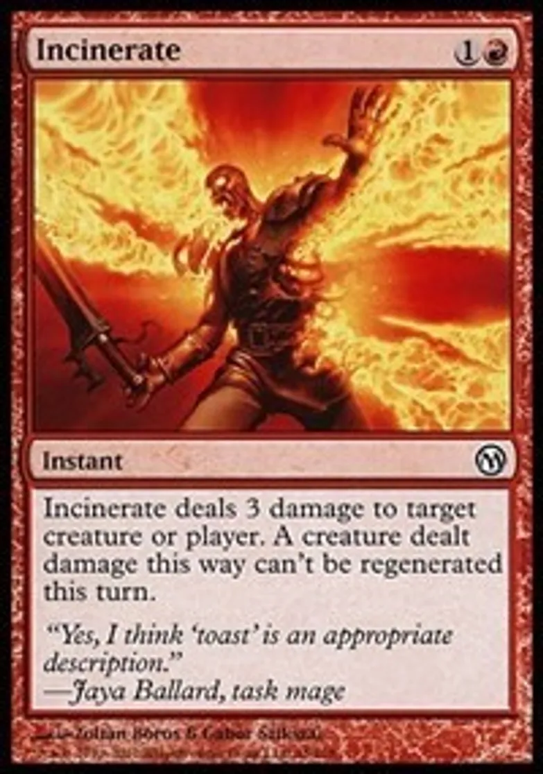 | Oracle Text | Incinerate deals 3 damage to target creature or player. A creature dealt damage this way can't be regenerated this turn. | ||