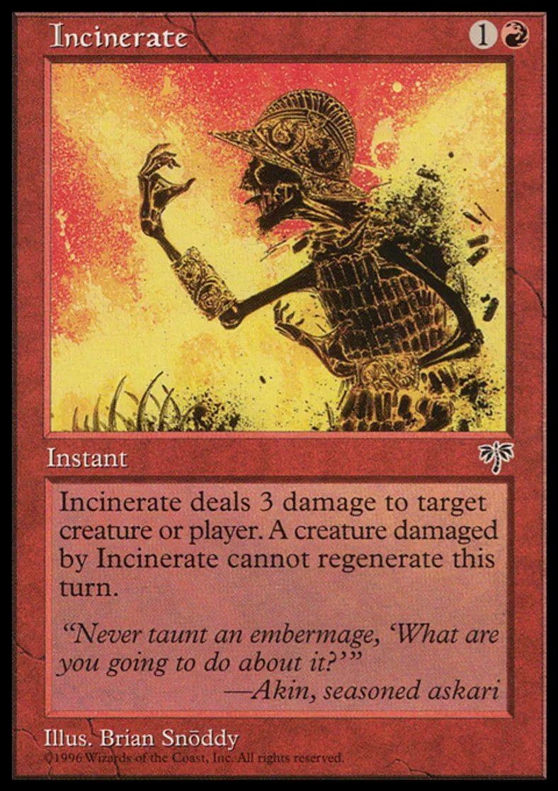 | Oracle Text | Incinerate deals 3 damage to target creature or player. A creature dealt damage this way can't be regenerated this turn. | ||