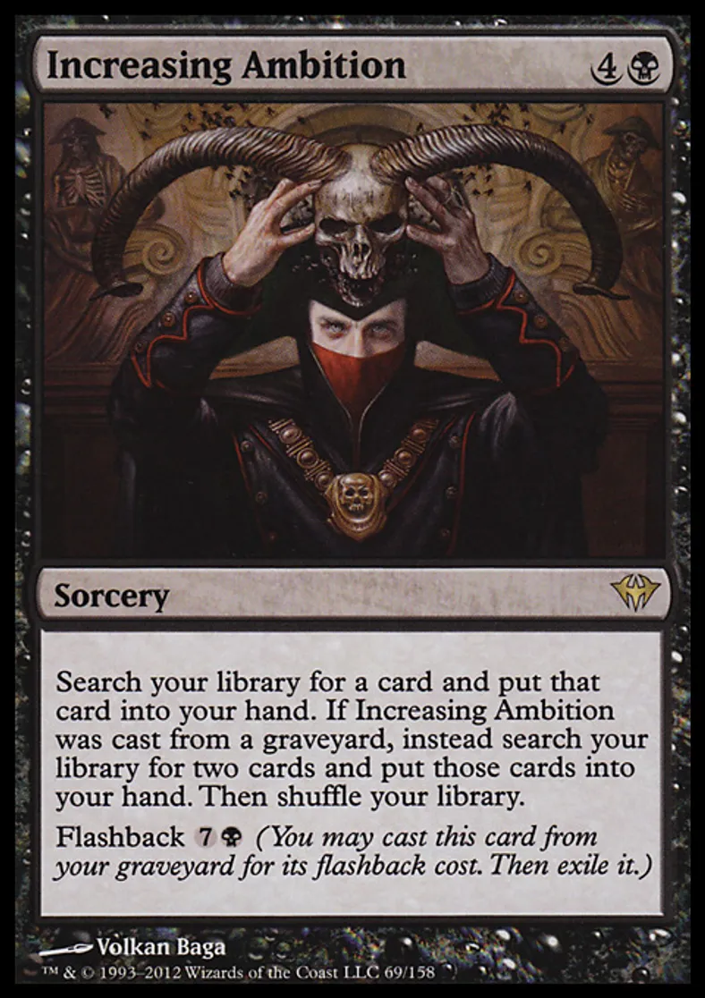 | Oracle Text | Search your library for a card and put that card into your hand. If Increasing Ambition was cast from a graveyard, instead search your library for two cards and put those cards into your hand. Then shuffle your library. Flashback {{7}}{{b}} (You may cast this card from your graveyard for its flashback cost. Then exile it.) | ||
