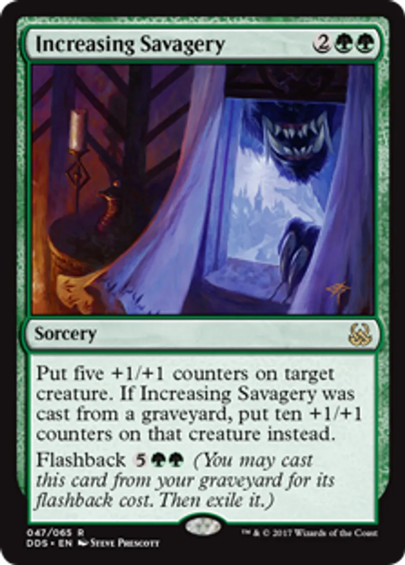 | Oracle Text | Put five +1/+1 counters on target creature. If Increasing Savagery was cast from a graveyard, put ten +1/+1 counters on that creature instead. Flashback {{5}}{{g}}{{g}} (You may cast this card from your graveyard for its flashback cost. Then exile it.) | ||