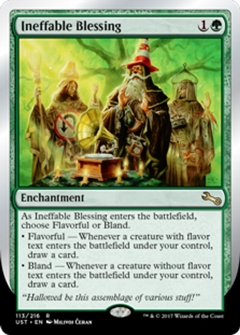 | Oracle Text | As Ineffable Blessing enters the battlefield, choose Flavorful or Bland. • Flavorful — Whenever a creature with flavor text enters the battlefield under your control, draw a card. • Bland — Whenever a creature without flavor text enters the battlefield under your control, draw a card. | ||