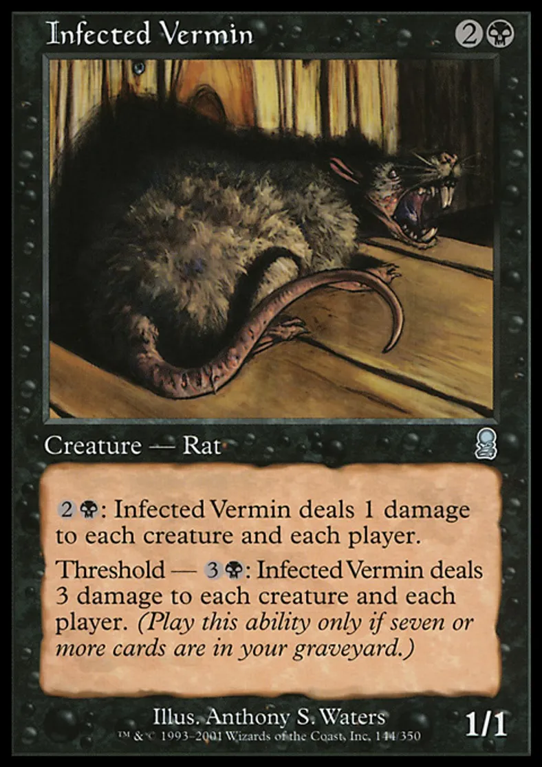 | Oracle Text | {{2}}{{b}}: Infected Vermin deals 1 damage to each creature and each player. Threshold — {{3}}{{b}}: Infected Vermin deals 3 damage to each creature and each player. Activate this ability only if seven or more cards are in your graveyard. | ||